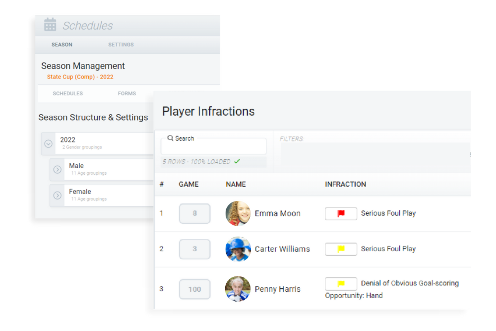 A great way to measure team and staff participation in games, as well as keep track of scores, is to compile post-match reports. Demosphere’s built-in reporting tools give a detailed breakdown of players, teams, and staff, as well as scoring. Then admins can take that one step further with our fully-customizable form builder to collect and report on important information such as player infractions, injuries, or other relevant custom data points, which can be completed by both team staff and officials.